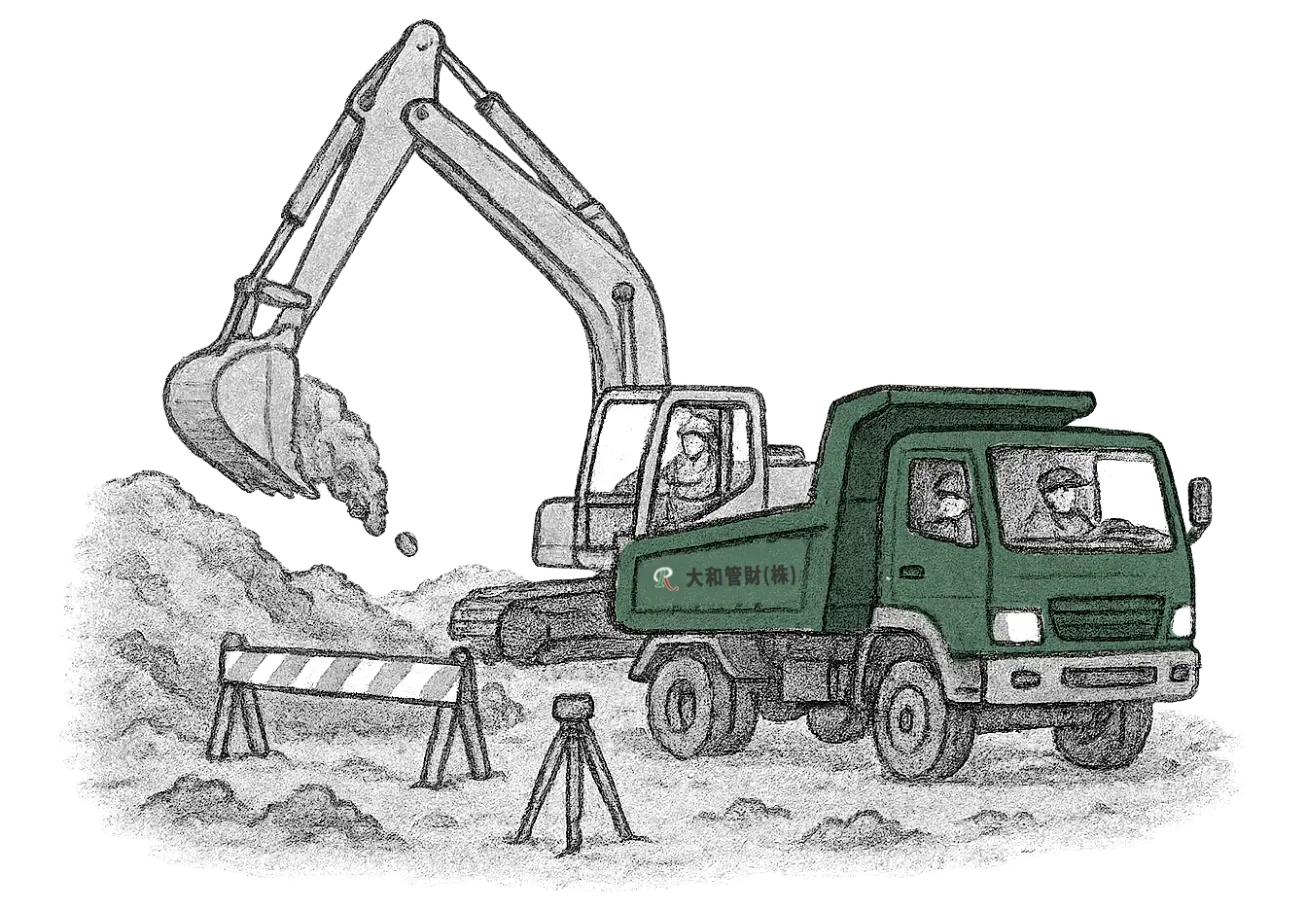 準備作業 - 必要な資材や重機を手配し、ダンプなどを使って現場へ搬入します。